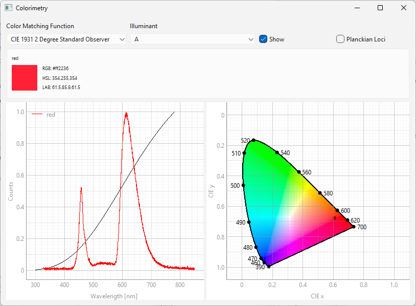 The top bar allows configuration of the illuminant and color matching function used in the analysis