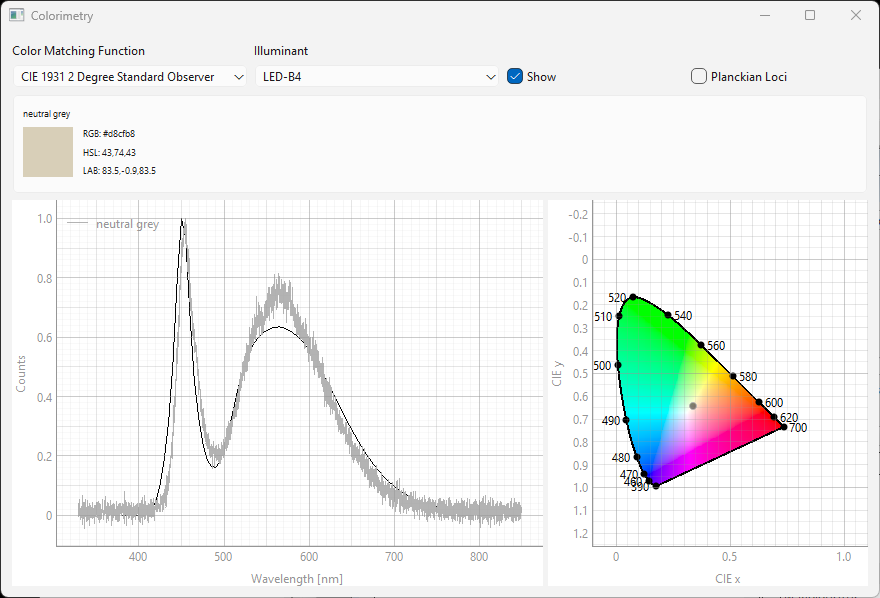 Figure 4.5 shows the spectrum reflected of an office desk with a bright white color. The black line represents the LED-B4 illuminant, a bright white LED light source with a color temperature of 5100 K, which is typical for office settings. The two spectra roughly match, indicating that this illuminant is a good choice to represent the light source used in this experiment. The calculated color is a slightly yellowish gray, which reasonably matches the visual perception of the desk’s color.