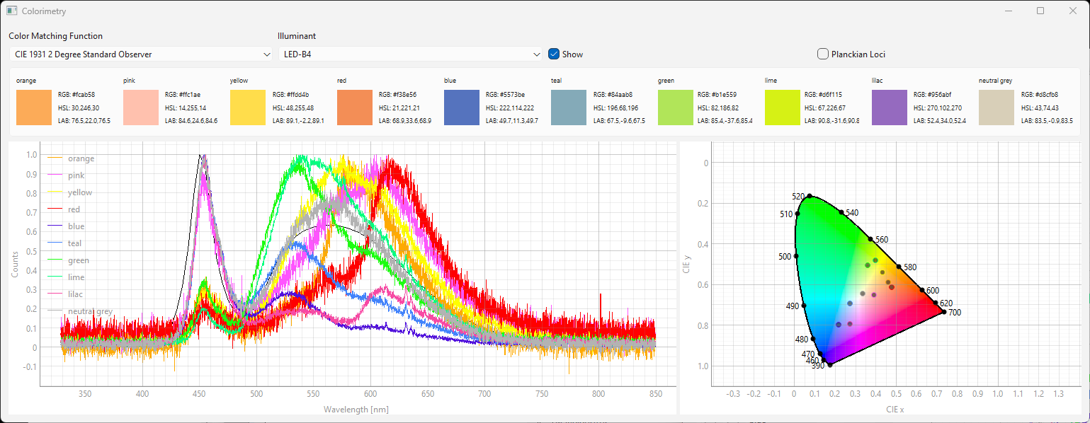 Figure 4.6 displays spectra obtained from different color samples (with the names taken from the color sample’s description) in the left pane. All spectra have been normalized, which is automatically done prior to analysis. Significant spectral differences even for perceptually ‘close’ colors (e.g. green and lime) can be observed. Using the correct illuminant, the calculated color and visually perceived color match quite well over a wide range of different colors. Color fidelity could be further improved by:
