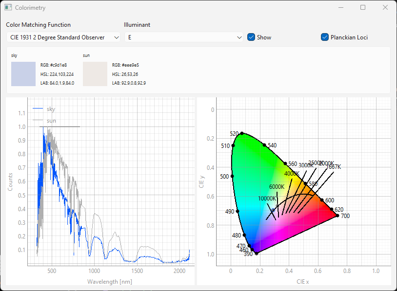 We can re-use the spectra obtained in Section 4.1 (The Solar Spectrum) for colorimetric analysis. Here, we are using the illuminant E, which is a flat curve (black trace in Figure 4.4), since spectra were obtained from an emissive source. Only the visible region of the spectrum is used for analysis and hence the majority of the spectrum, which falls into the mid-IR range, is ignored.
