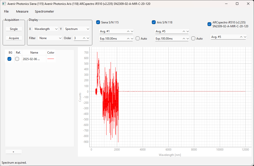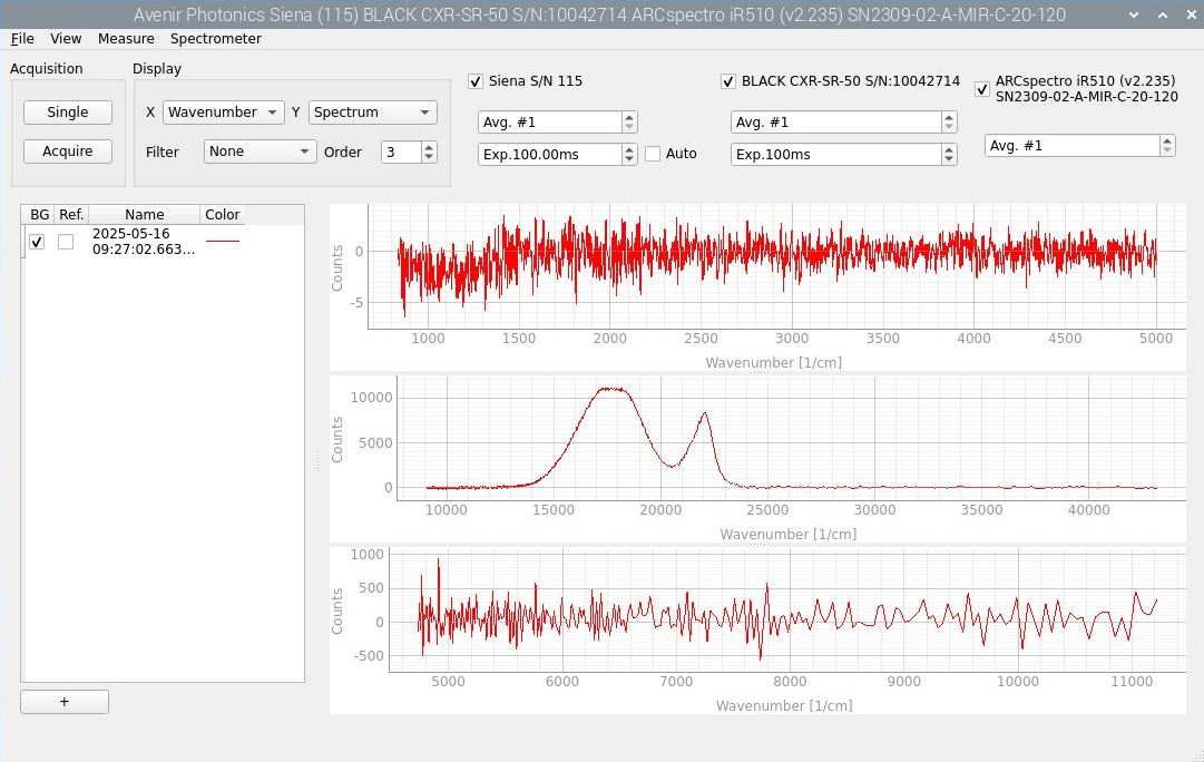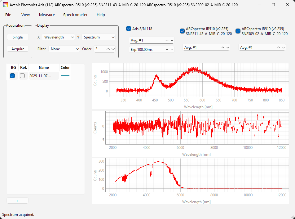 the Combined view. Here, spectra from different devices are combined and displayed on the same spectral axis. This is useful when using multiple spectrometers to expand spectral coverage.