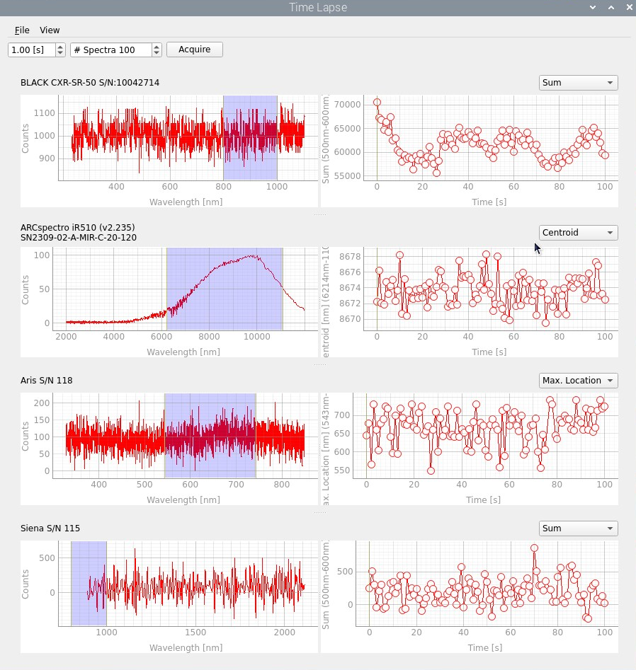 The menu gives access to Time-lapse Recordings, which allows software-synchronized time-lapse acquisitions using multiple spectrometers. In the Time-Lapse window, you can switch between Combined and Split display using the menu.