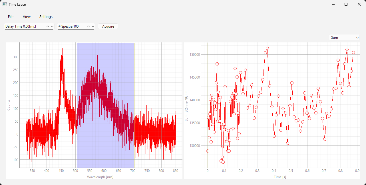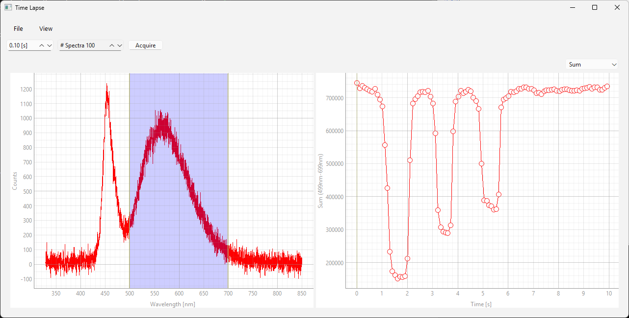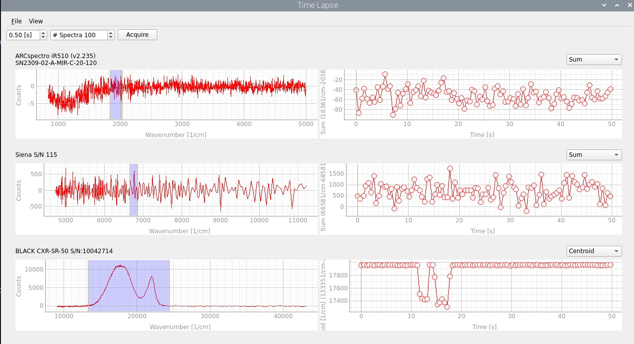 In time-lapse recordings, spectra are recorded at regular intervals, e.g. to monitor a chemical reaction. TII Spectrometry supports two time-lapse modalities: