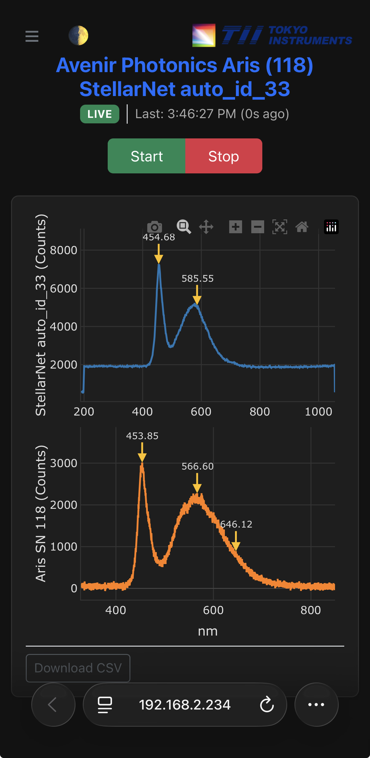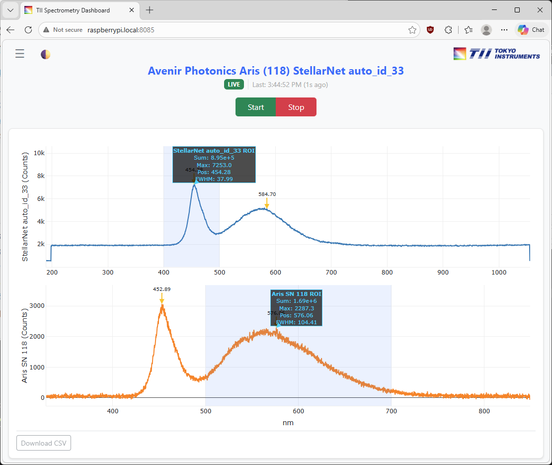 Start ボタンは分光計を起動し、Stop ボタンはスペクトルの表示を一時停止します。