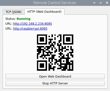 TII Spectrometry は、TCP/IP サーバーと HTML Web サーバー を公開しており、これらを使用して接続された分光計をリモートで制御および監視できます。この機能は、 からアクセスして、リモート コントロール ダイアログ ウィンドウ (図 2.10) を表示することで利用できます。